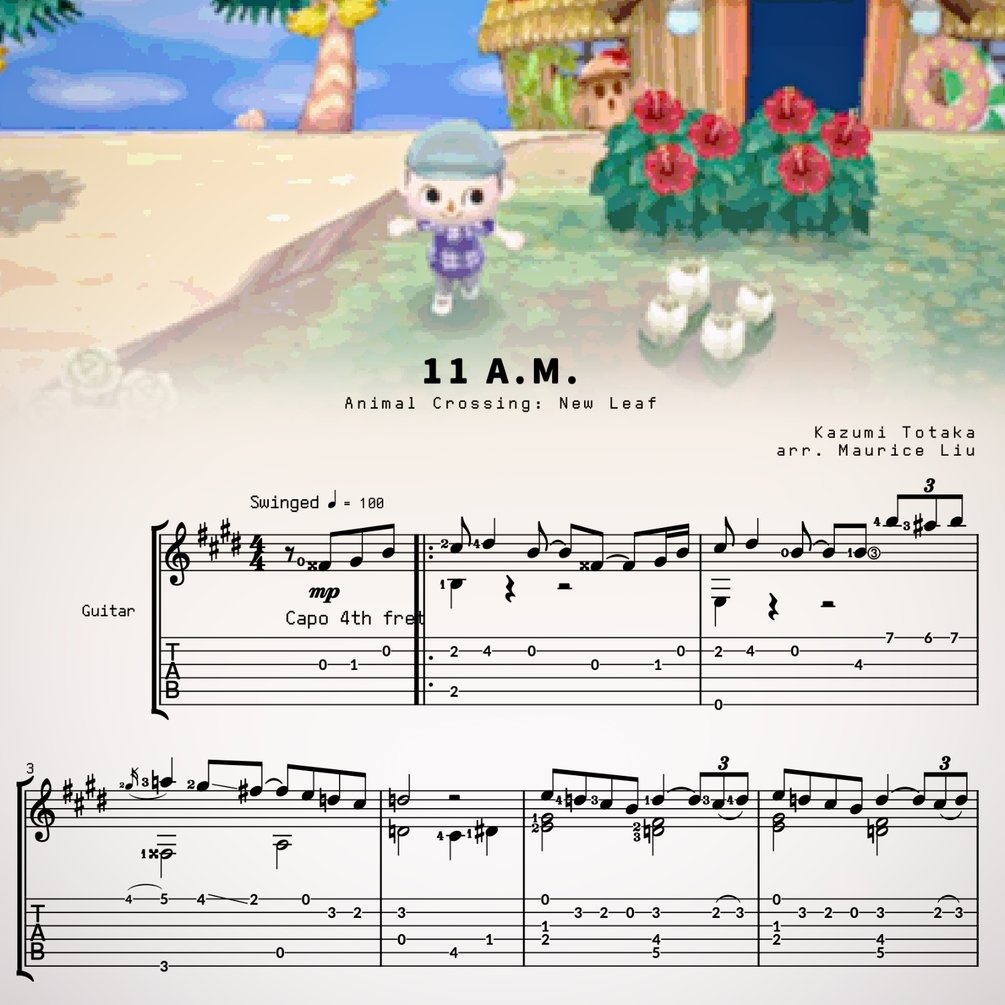This is my guitar arrangement sheet music and tabs for 11 A.M. from Animal Crossing: New Leaf, composed by Kazumi Totaka.