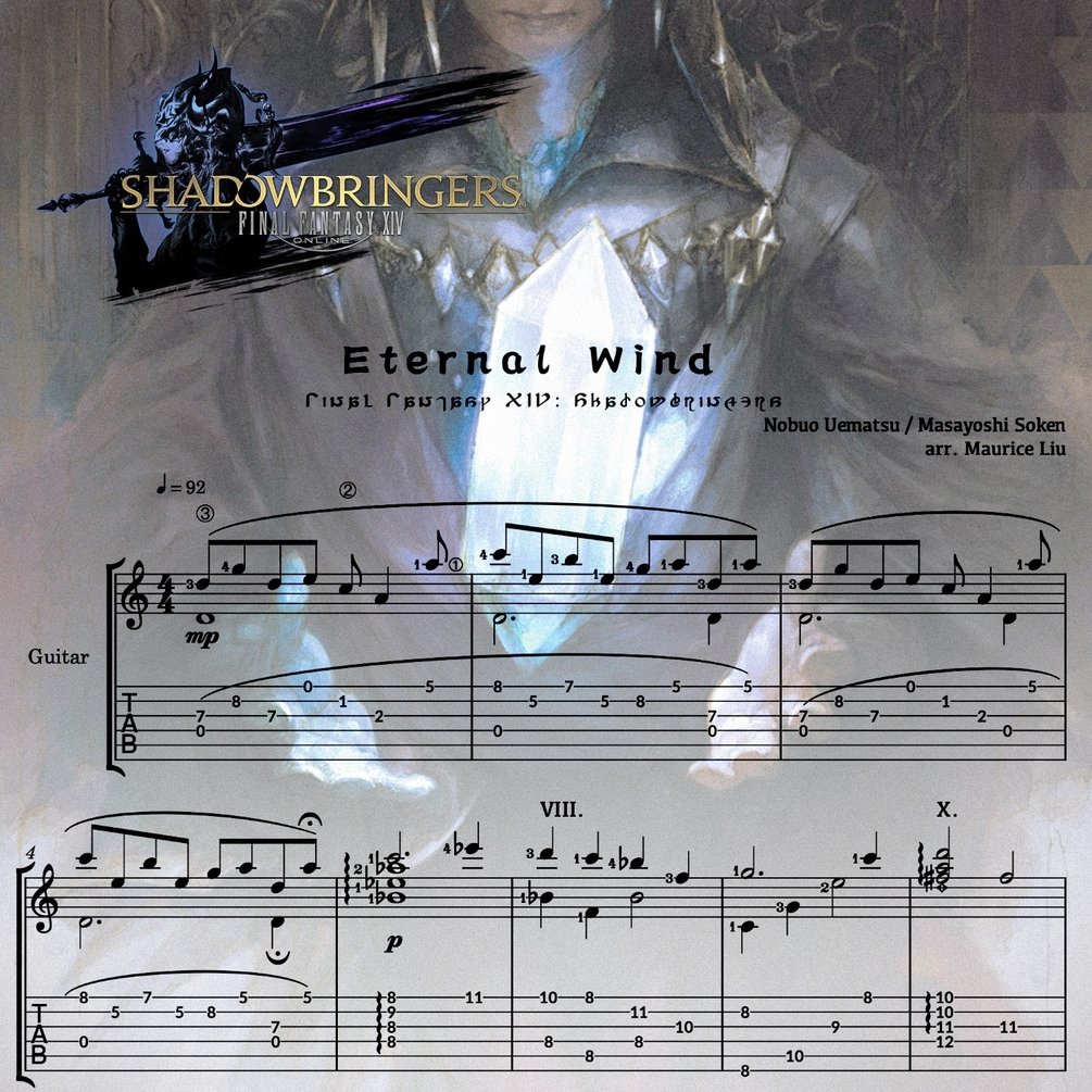 This is my classical guitar arrangement sheet music + tab for Eternal Wind (piano ver. ) from Final Fantasy XIV: Shadowbringers, composed by Nobuo Uematsu and Masayoshi Soken.