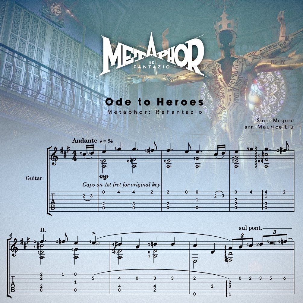 This is my guitar arrangement sheet music and tabs for Ode to Heroes from Metaphor: ReFantazio, composed by Shoji Meguro.