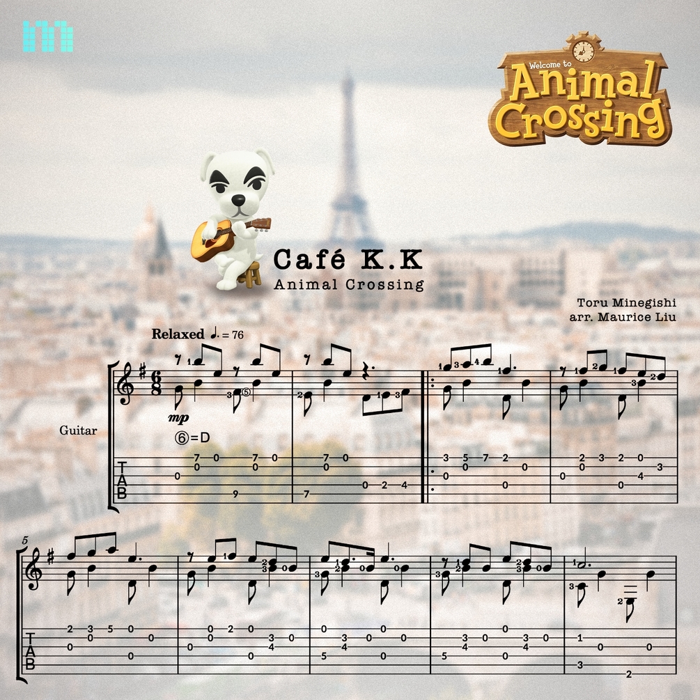 This is my guitar arrangement sheet music and tabs for Café K.K from Animal Crossing, composed by Toru Minegishi.