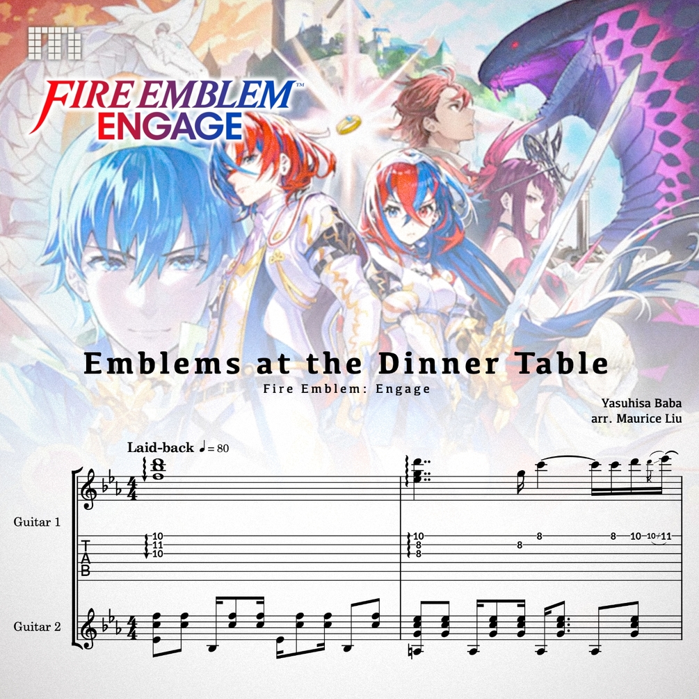 This is my duo guitar transcription sheet music and tabs for Emblems at the Dinner Table from Fire Emblem: Engage, composed by Yasuhisa Baba and co. Including a version of tabs for only guitar 1 part!