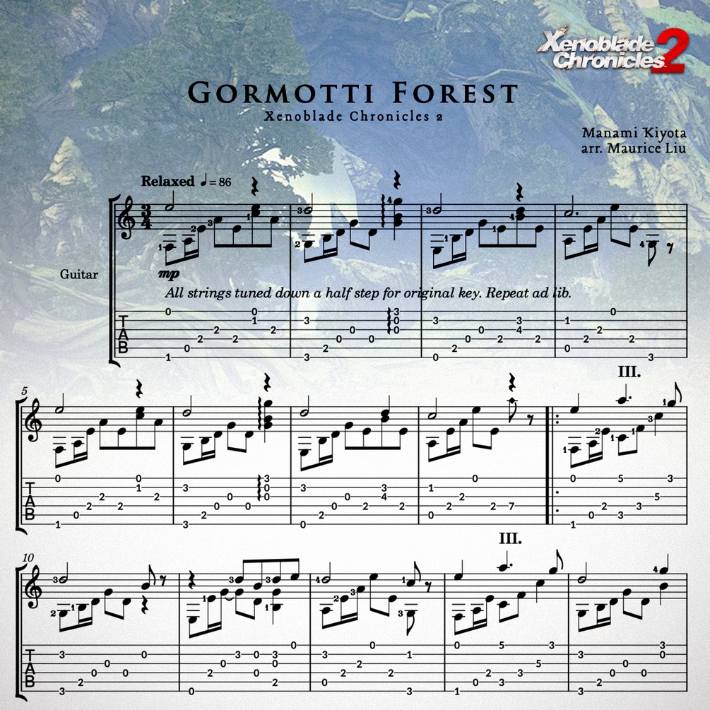This is my guitar arrangement sheet music and tabs for Gormotti Forest from Xenoblade Chronicles 2, composed by Manami Kiyota.