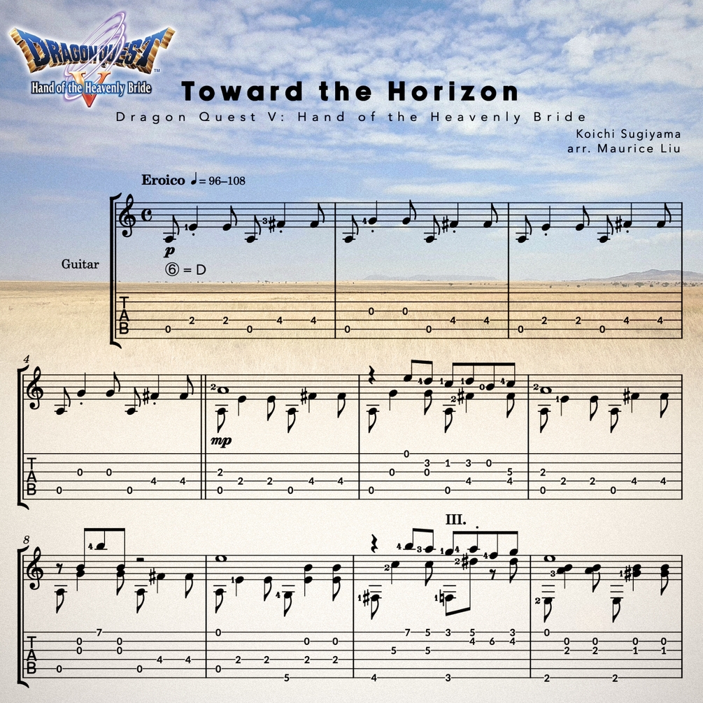 This is my guitar arrangement sheet music and tabs for Toward the Horizon from Dragon Quest V, composed by Koichi Sugiyama.