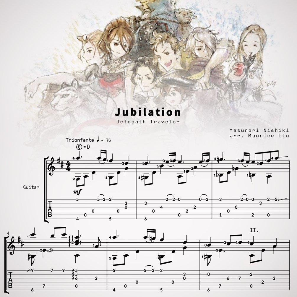 This is my guitar arrangement sheet music and tabs for Jubilation from Octopath Traveler, composed by Yasunori Nishiki.