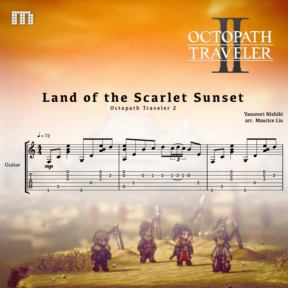 This is my solo classical guitar arrangement sheet music + tab for Land of the Scarlet Sunset (Ku) from Octopath Traveler 2, composed by Yasunori Nishiki.