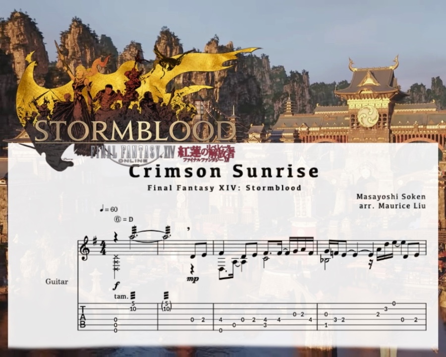 This is my classical guitar arrangement sheet music + tab for Crimson Sunrise / 紅の夜明け 〜クガネ:昼〜 from Final Fantasy XIV: Stormblood, composed by Masayoshi Soken.