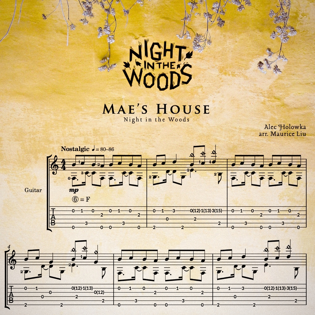 This is my guitar arrangement sheet music and tabs for Mae's House from Night in the Woods, composed by Alec Holowka.