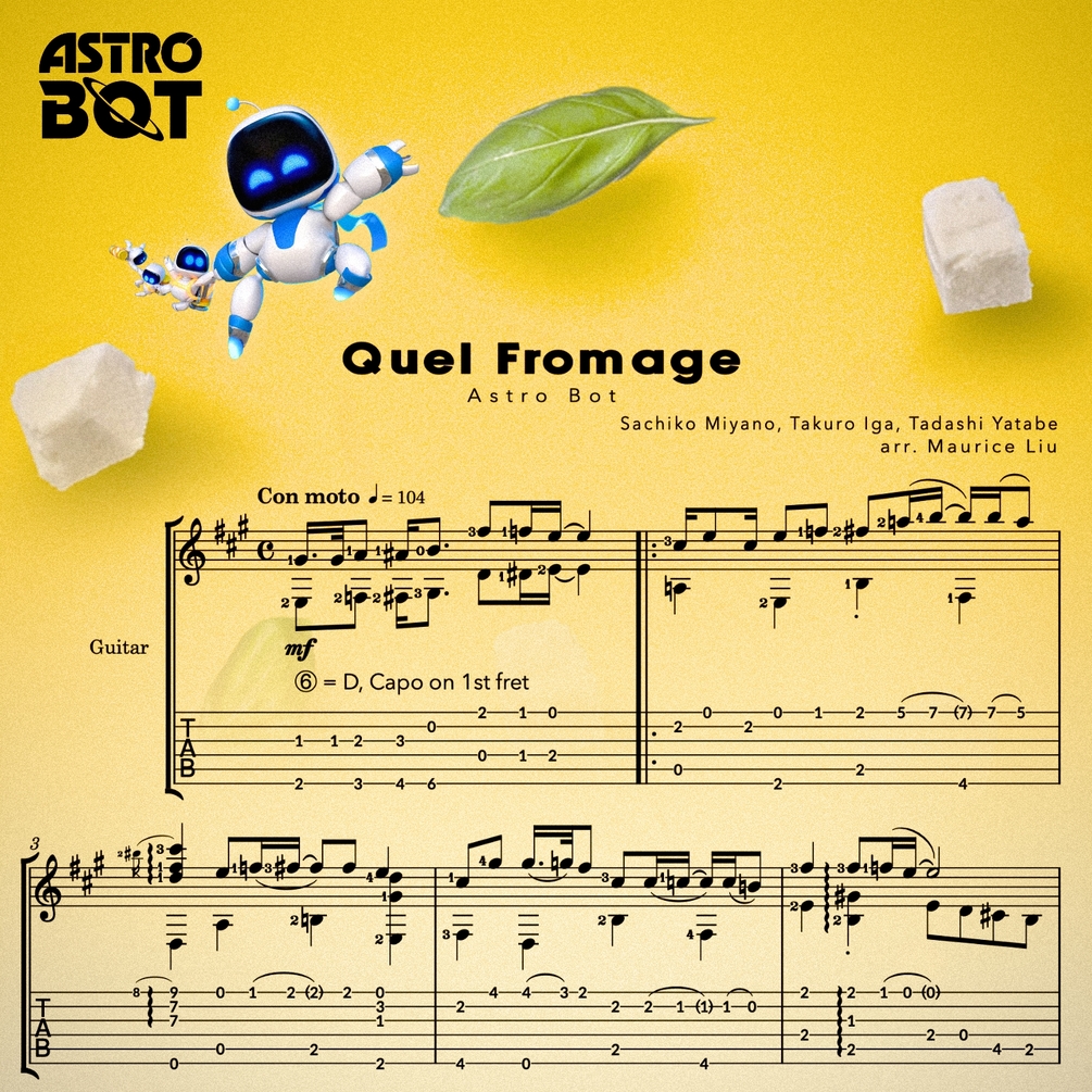 This is my guitar arrangement sheet music and tabs for Quel Fromage from Astro Bot, composed by Sachiko Miyano, Takuro Iga, and Tadashi Yatabe.