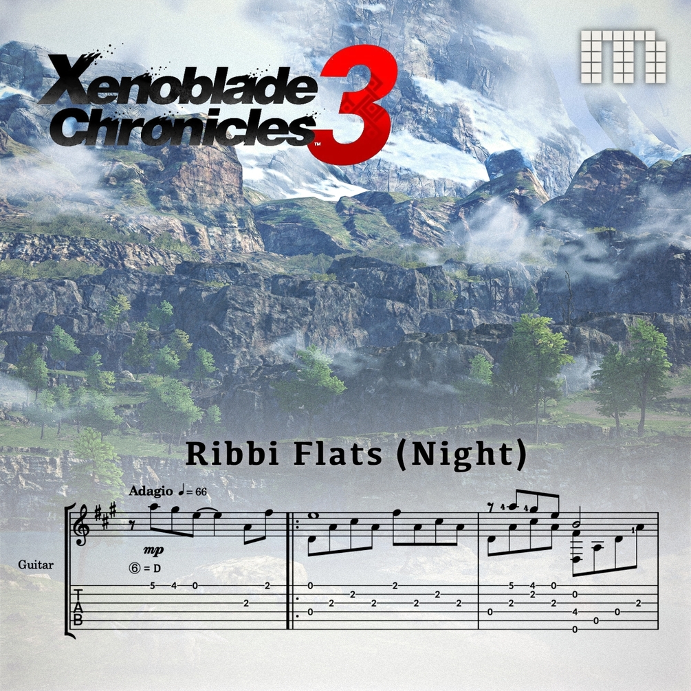 This is my solo classical guitar arrangement sheet music + tab for Ribbi Flats (Night) from Xenoblade Chronicles 3, composed by Kenji Hiramatsu.