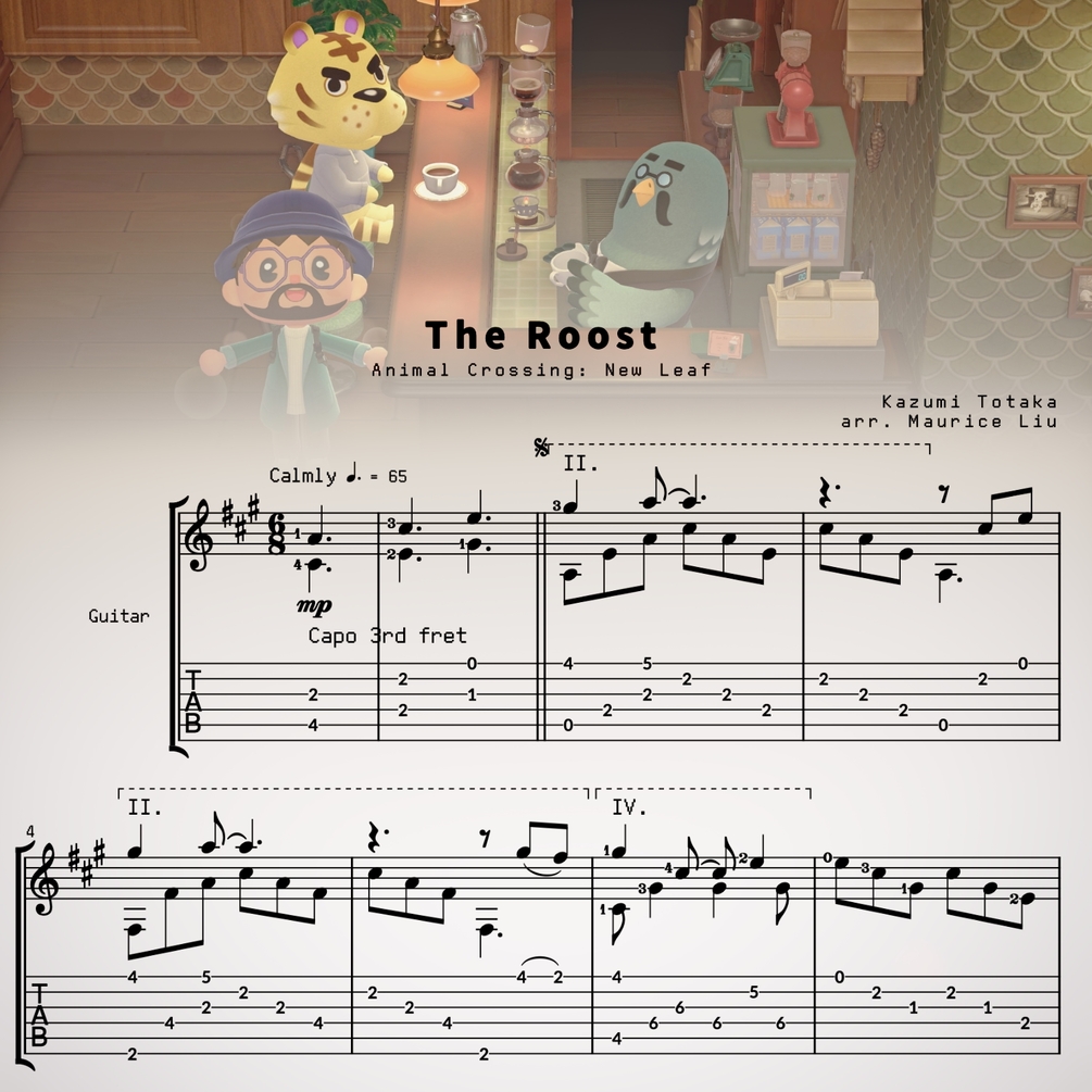 This is my guitar arrangement sheet music and tabs for The Roost from Animal Crossing: New Leaf and New Horizons, composed by Kazumi Totaka.