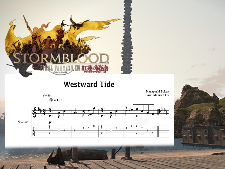 This is my classical guitar arrangement sheet music + tab for Westward Tide / 宵の海 from Final Fantasy XIV: Stormblood, composed by Masayoshi Soken.