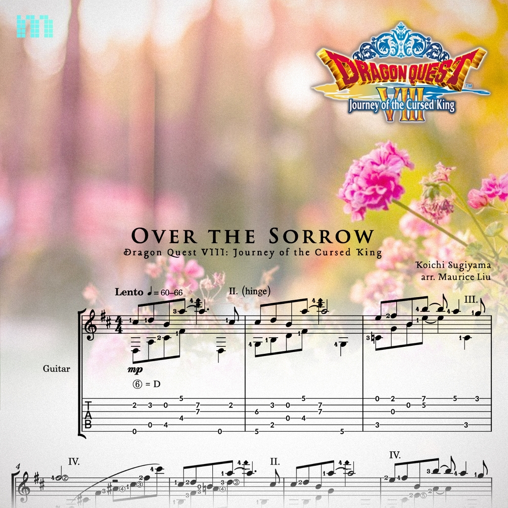 This is my solo classical guitar arrangement sheet music and tabs for Over the Sorrow from Dragon Quest VIII, composed by Koichi Sugiyama.