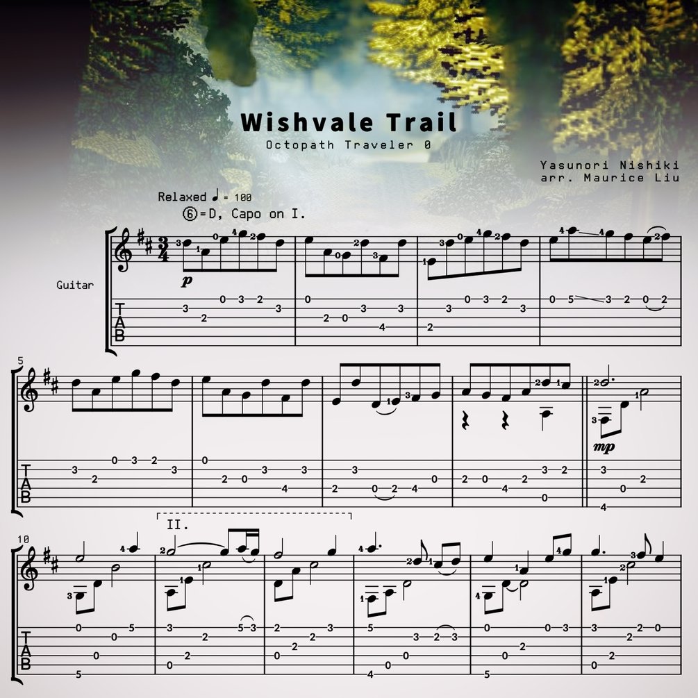 This is my guitar arrangement sheet music and tabs for Wishvale Trail from Octopath Traveler 0, composed by Yasunori Nishiki.