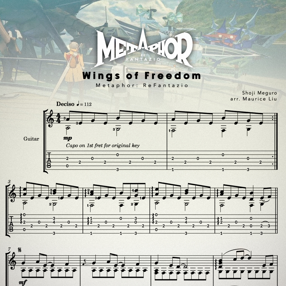 This is my guitar arrangement sheet music and tabs for Wings of Freedom from Metaphor: ReFantazio, composed by Shoji Meguro.